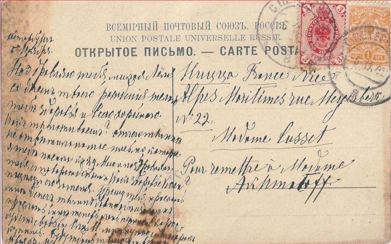 В своем нынешнем сообщении Юрий Вилинский прислал мне старинную открытку с изображением Гатчинского Дворца. Открытка была адресована некой Леле (Елене) Ахматовой в Ниццу. Юрий Вилинский просил попробовать установить возможную отправительницу открытки и выяснить: не проживала ли отправительница в Гатчине.